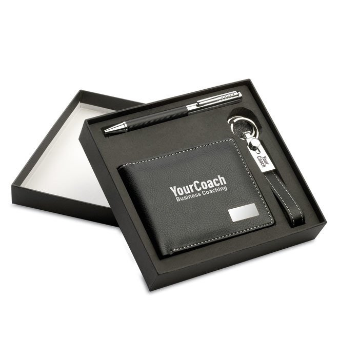 Elegancki zestaw upominkowy: portfel z PU z kontrastującym przeszyciem, przekręcany długopis z niebieskim wkładem