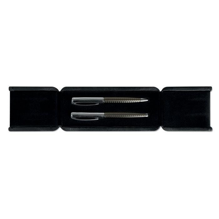 Zestaw piśmienniczy w etui. Zawiera przekręcany długopis oraz pióro kulkowe, obydwa z mosiądzu. Niebieski wkład.