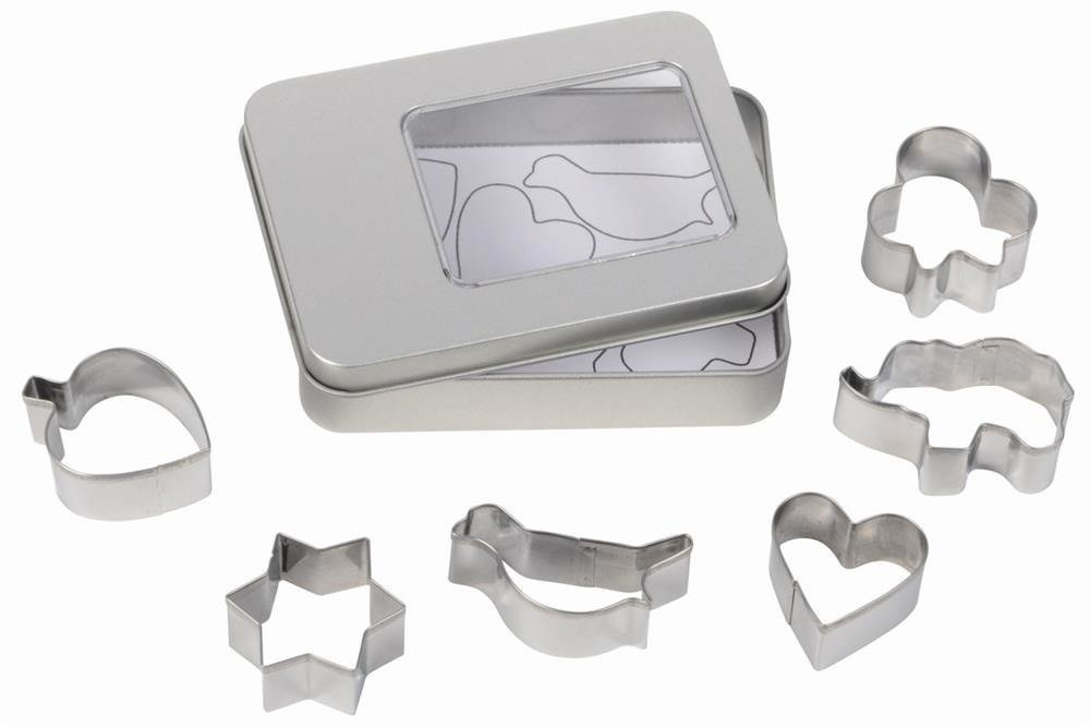 Zestaw foremek do pieczenia COOKIE BOX zawierający 6 różnych, odpornych na rdzę foremek ze stali nierdzewnej. Skrzyneczka ze stali nierdzewnej z okienkiem.