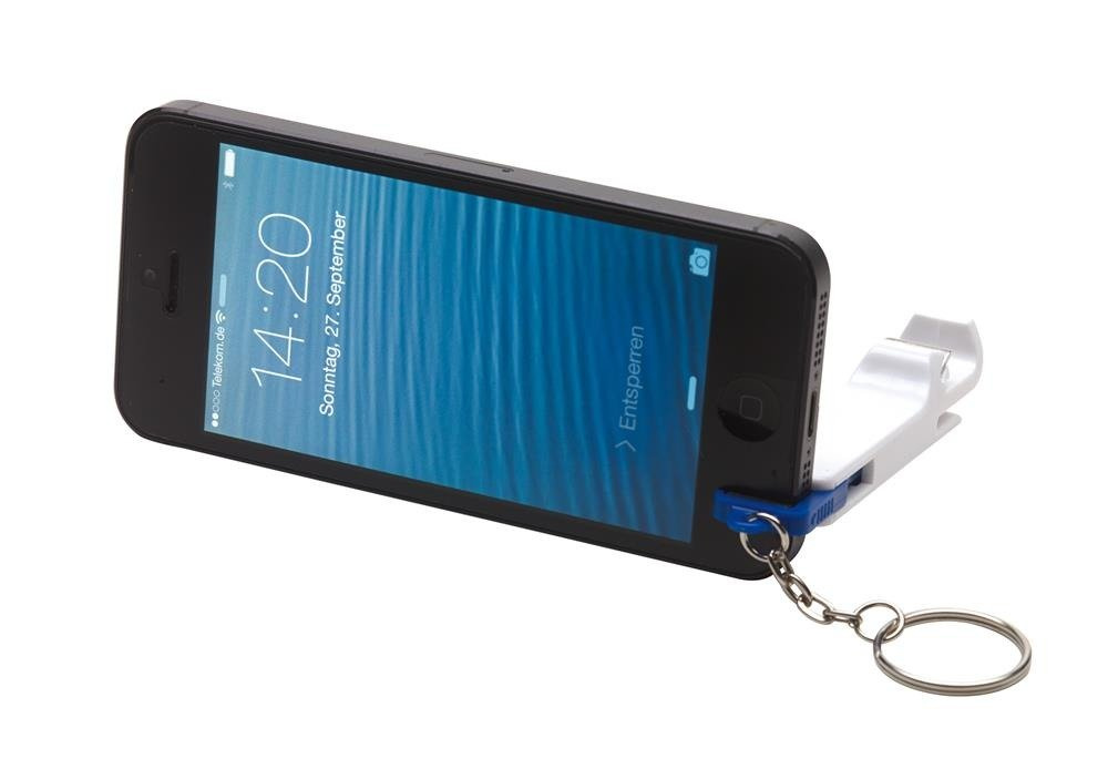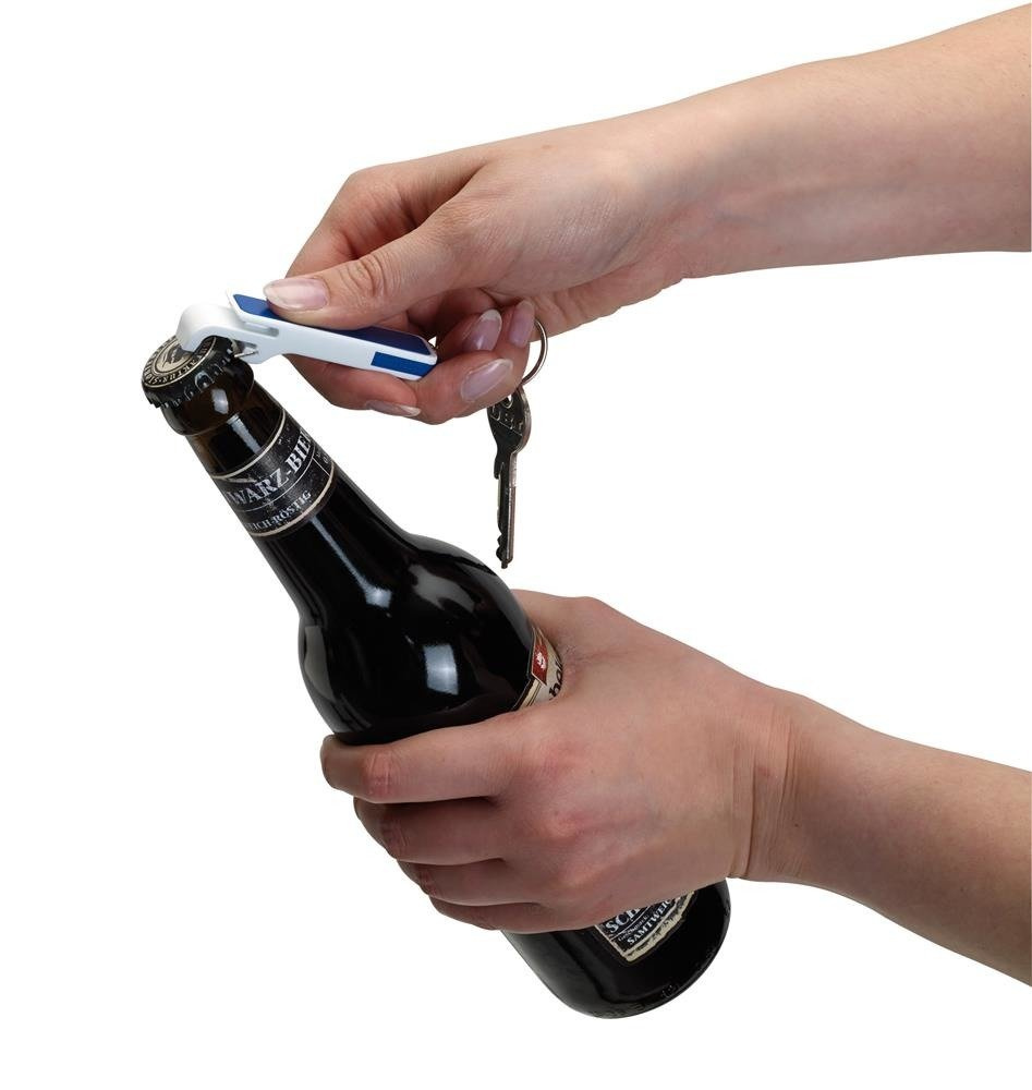 Brelok DOUBLE OPEN z wysuwaną podstawką na smartfon i zintegrowanym otwieraczem do butelek.