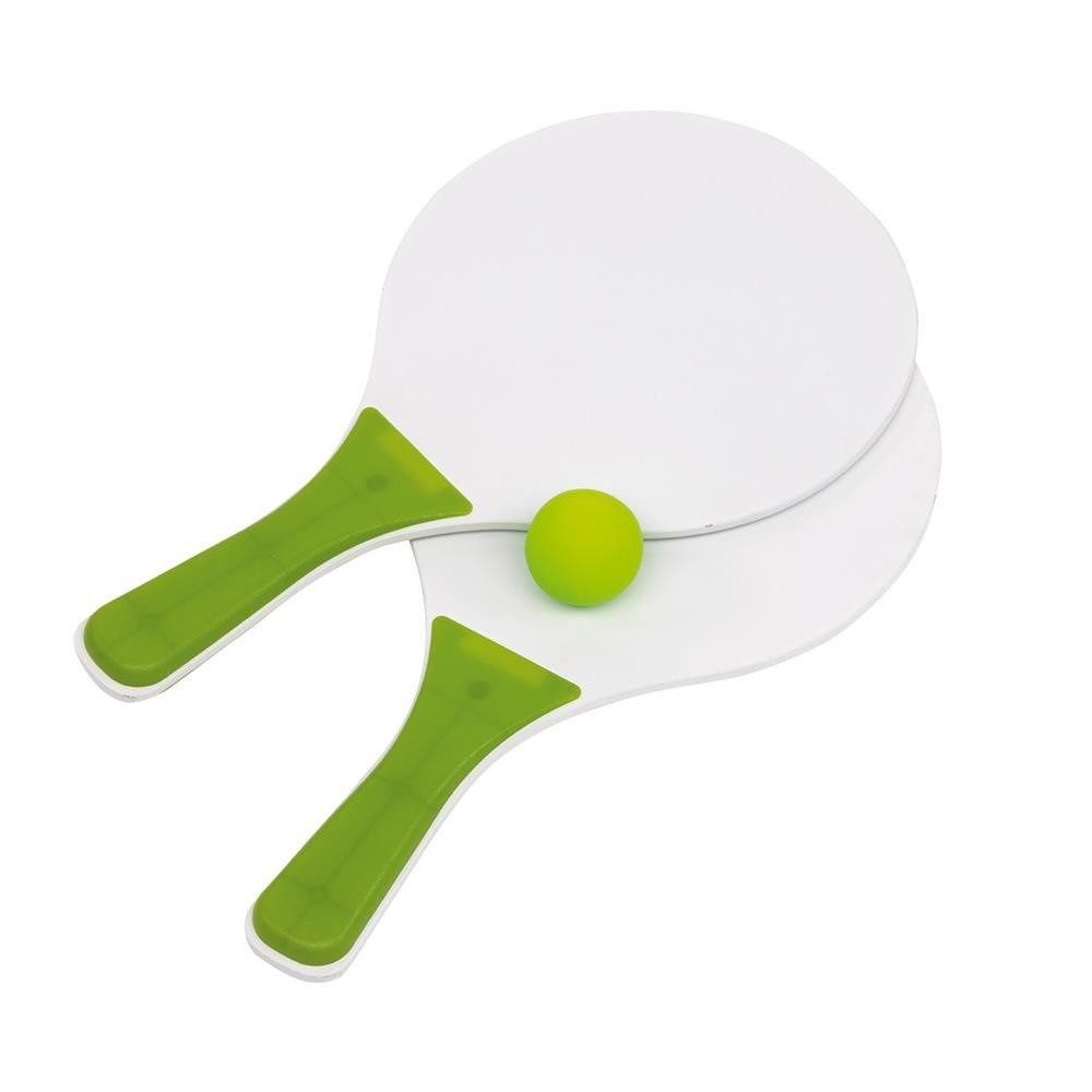 Zestaw plażowy SUMMER FEELING zawiera dwie drewniane paletki z kolorowymi uchwytami, jedną miękką piłkę, zapakowany w siatkową torbę.