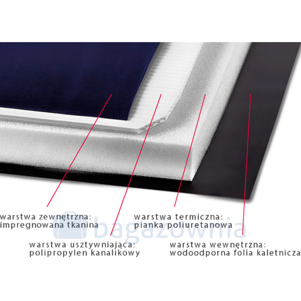 - 4-warstwowa ścianka ( tkanina kaletnicza + 3 mm polipropylen kanalikowy + 20 mm pianka poliuretanowa + folia kaletnicza )