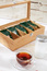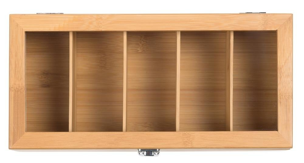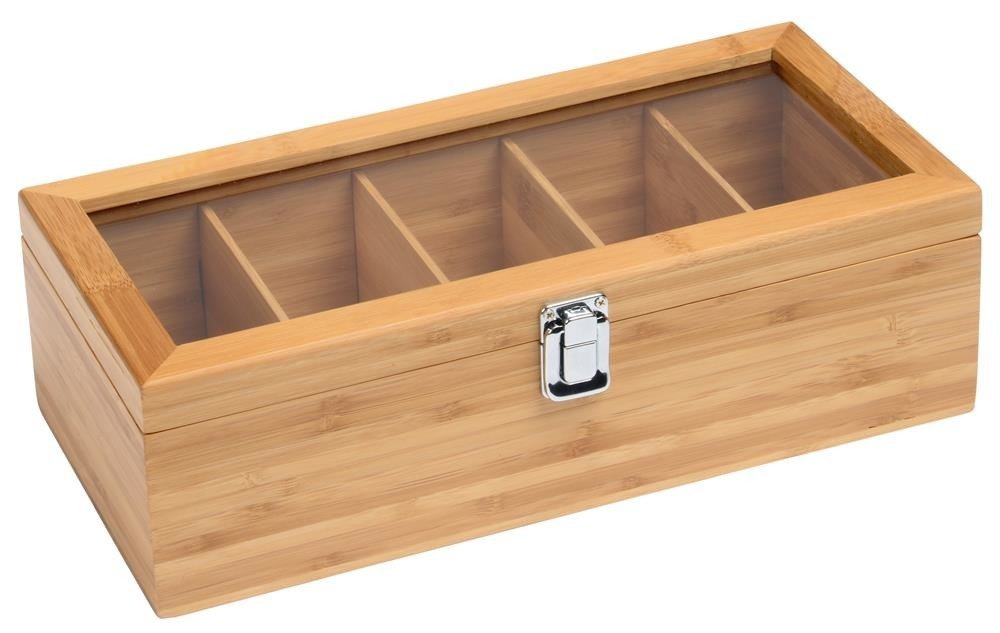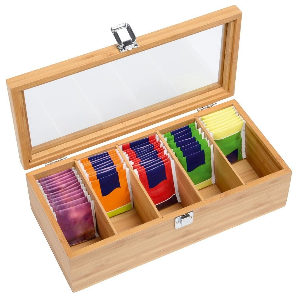 Pojemnik na herbatę TEA LOUNGE z 5 oddzielnymi przegródkami na torebki z herbatą, ze szklaną pokrywką i zatrzaskiem, wykonany z bambusa.