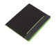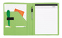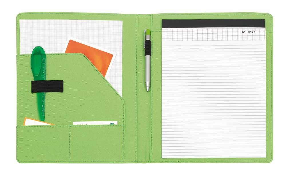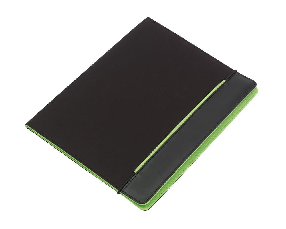 Z notesem, wsuwanymi kieszonkami, pętelkami na długopis i inne akcesoria, zamykane gumką.