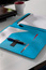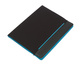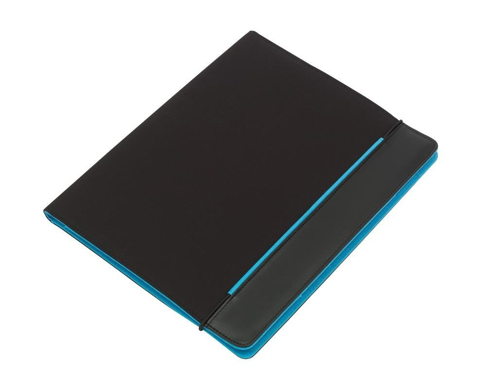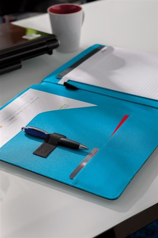 Z notesem, wsuwanymi kieszonkami, pętelkami na długopis i inne akcesoria, zamykane gumką.