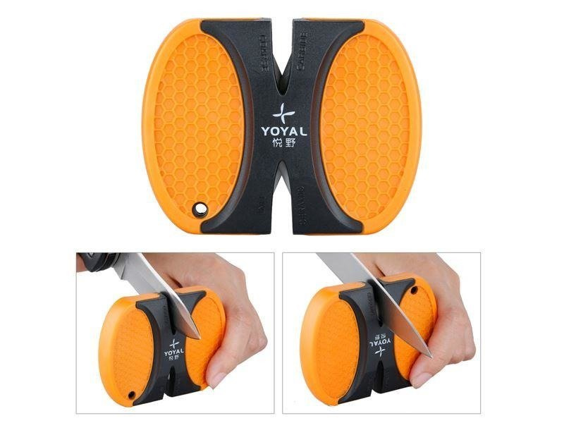 Ostrzałka terenowa Taidea Yoyal do ostrzenia noży z wyprowadzonym kątem ostrzenia na kamieniu i węglikach. Oczko do przeplecenia rzemyka oraz gumowe stopki. Masa netto około 40 gram.