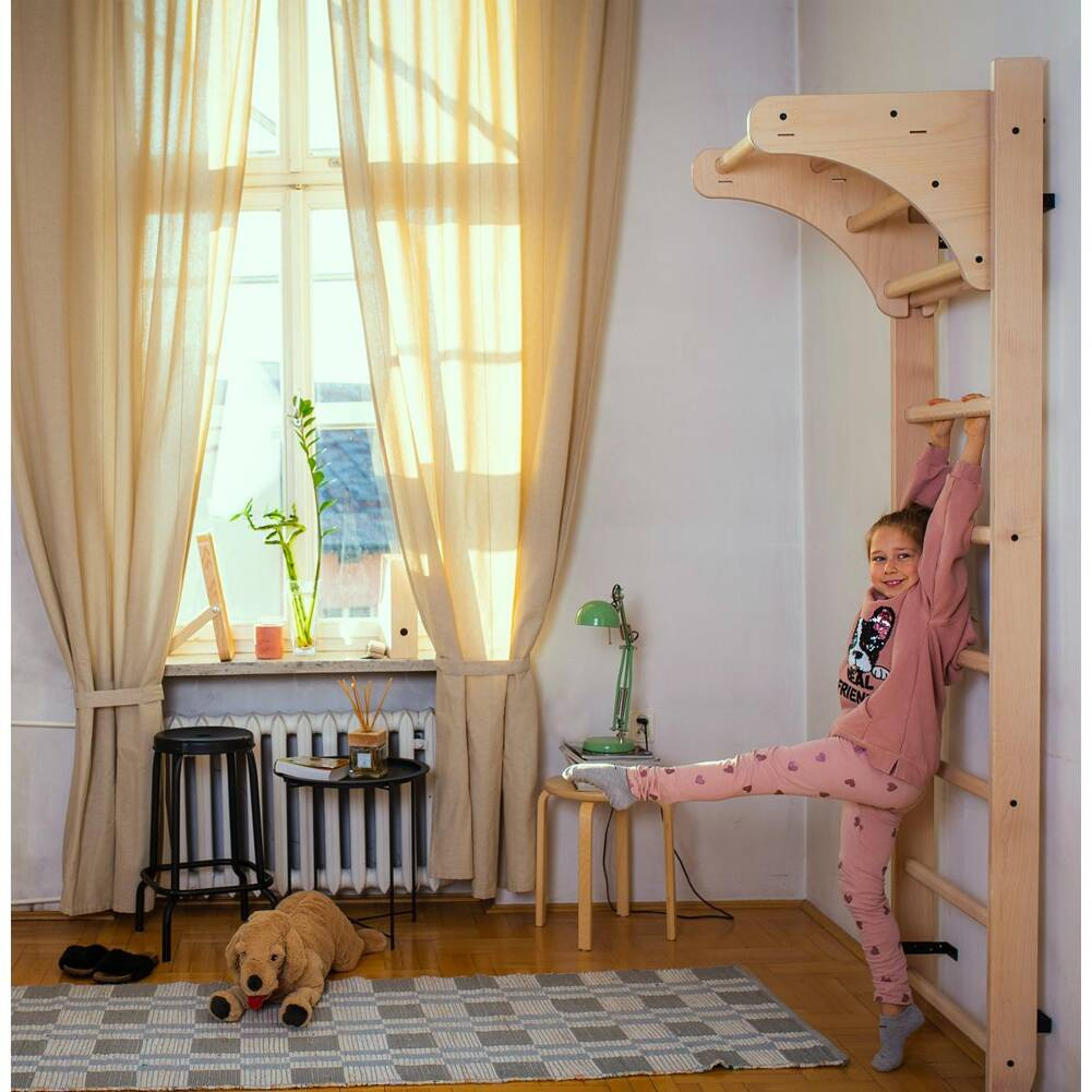 Drabinka stanowi połączenie tradycji z nowoczesnością, w formie połączenia drewnianej drabinki wraz z zdejmowalnym drewnianym drążkiem do podciągania.To sprzęt, który nie zajmuje wiele miejsca, dając przy tym wielkie możliwości. Drabinka tworzy stylowe wykończenie pokoju czy salonu. Przy projekcie drabinki zadbano o to, aby pasowała do obecnych trendów w aranżacji wnętrz. Systematyczna aktywność na wielofunkcyjnej drabince wspiera prawidłowy rozwój fizyczny dziecka. Ruch i zabawa wprowadzają dzieci w dobry nastrój oraz dają im okazję do wyładowania swej energii. Drabinka to produkt, który idealnie sprawdzi się w każdym pokoju dziecinnym. Jest ona ciekawym elementem wystroju każdego pomieszczenia. Zajmuje niewielką powierzchnię, jest łatwa w montażu, trwała i bezpieczna.
