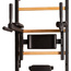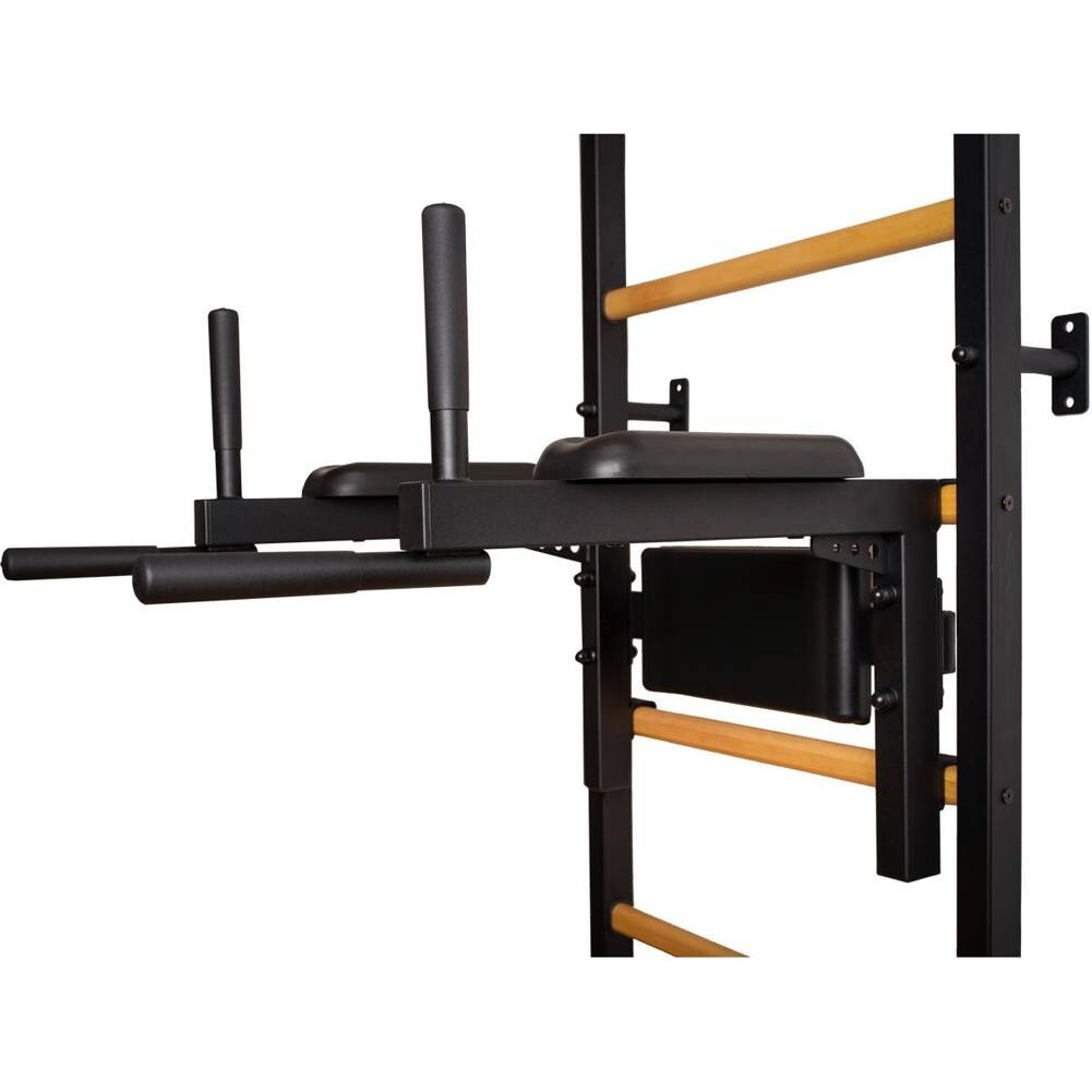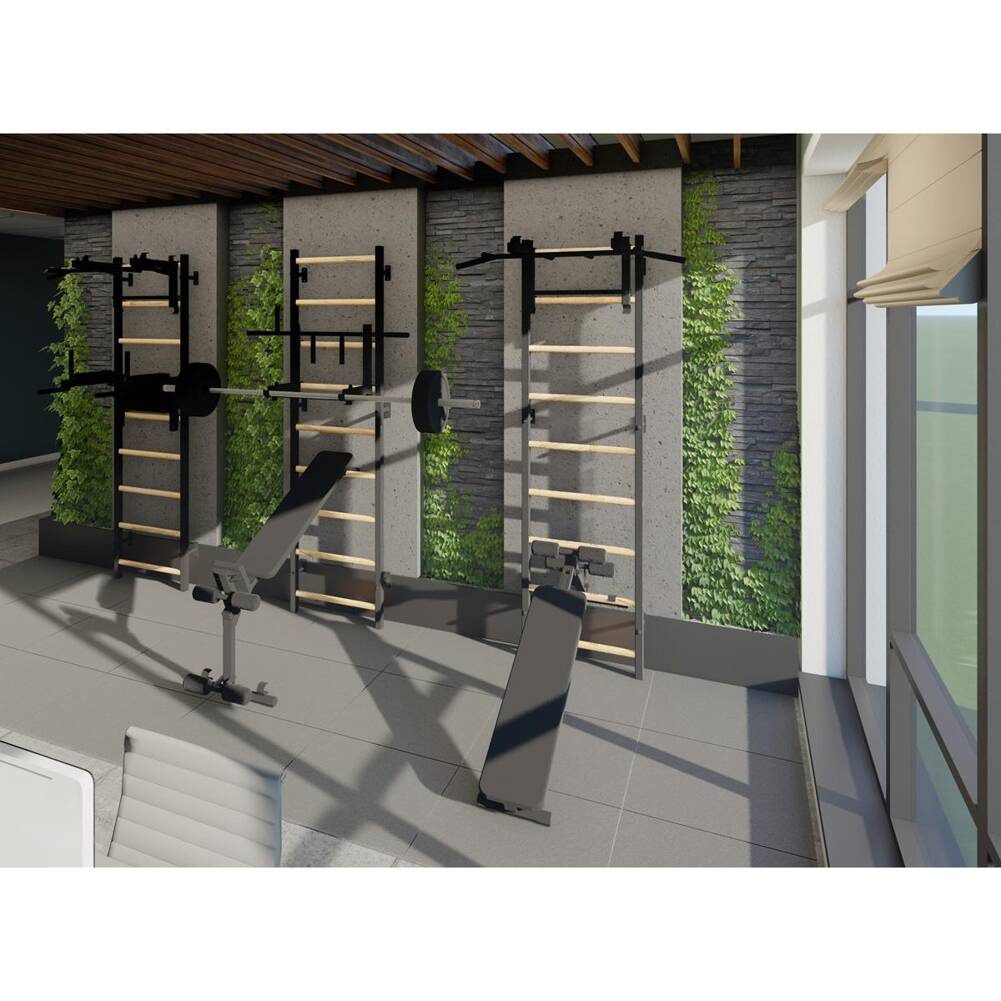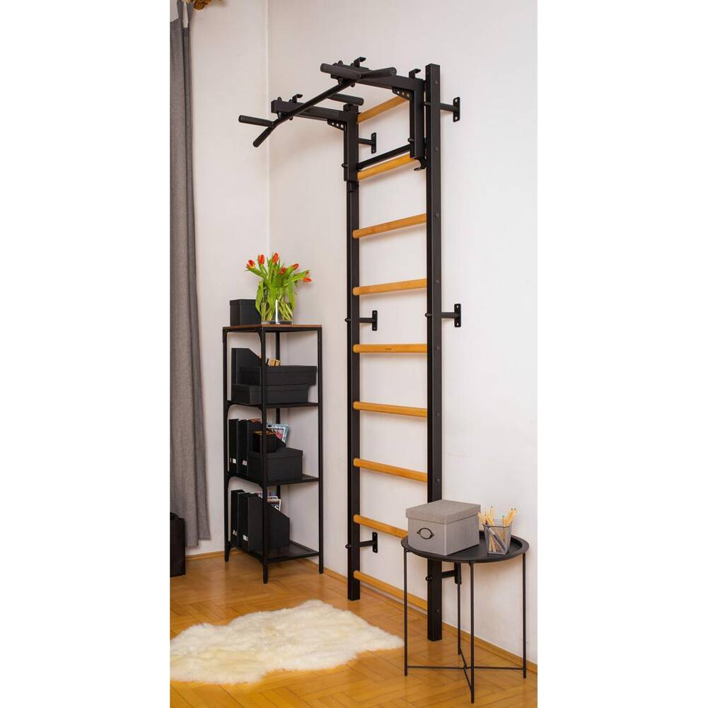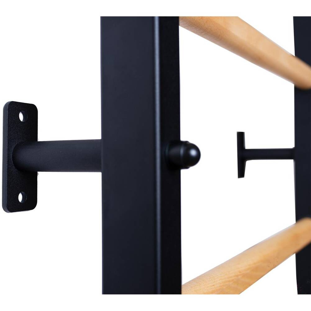 Drabinka gimnastyczna z regulowanym drążkiem oraz poręczą to model, który idealnie pasuje do skandynawskiego stylu wnętrz. Pionowe profile (40mm x 50 mm) wykonane są z wysokiej jakości metalu pomalowanego proszkowo. Szczebelki są wykonane z buku o owalnym kształcie, powierzchnia szczebelków jestb olejowana ręcznie, to wszystko wpływa na to, że użytkowanie drabinki jest komfortowe. W górnej części drabinki znajduje się zdejmowany metalowy drążek do podciągania, który wyposażony jest w 6 różnych rączek pozwalających pracować nad siłą mięśni ramion i pleców za pomocą różnych chwytów, np. chwytem szerokim. Drabinka stworzona została z myślą o osobach, które chcą pracować nad swoją sylwetką w zaciszu swojego domu. Drabinka pozwala wykonywać wiele różnorodnych ćwiczeń, nie zajmując przy tym dużo miejsca. Design przemyślano tak, aby pasował do aktualnych trendów w aranżacji wnętrz, nie zaburzając ogólnego wystroju mieszkania. Jedna osoba dorosła może zmienić regulację wysokości drążka oraz zmienić pozycję. Jeżeli obrócimy drążek do podciągania, będzie on słuzył jako uchwyt pod sztangę.