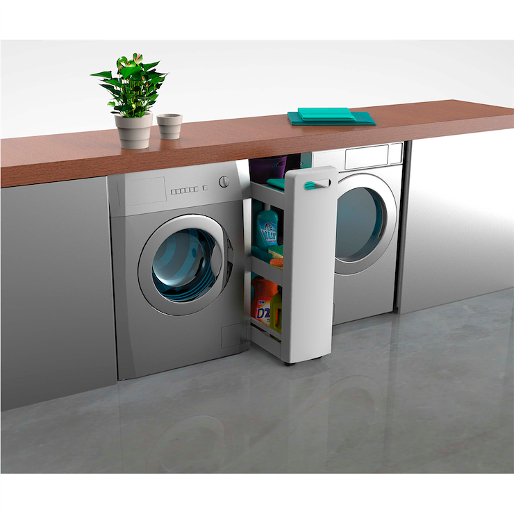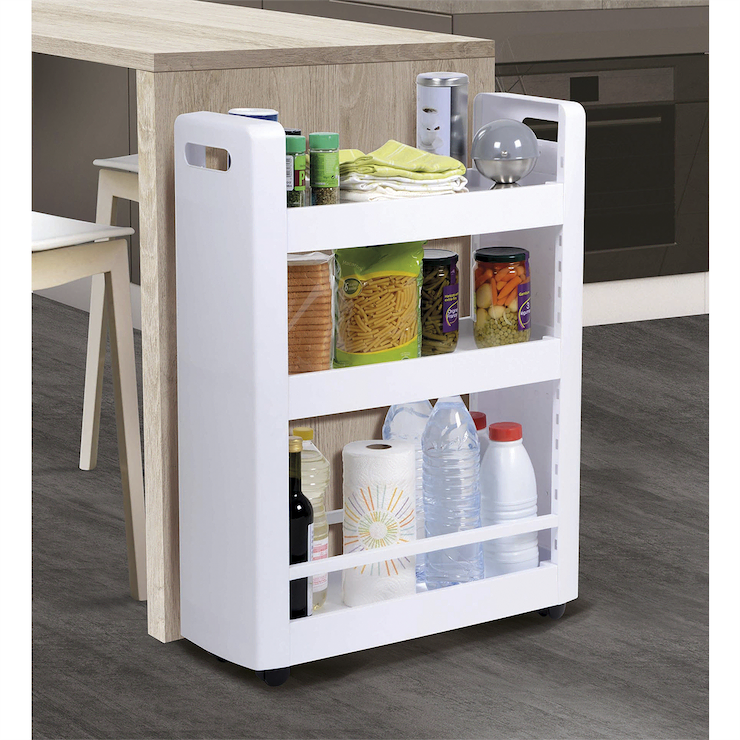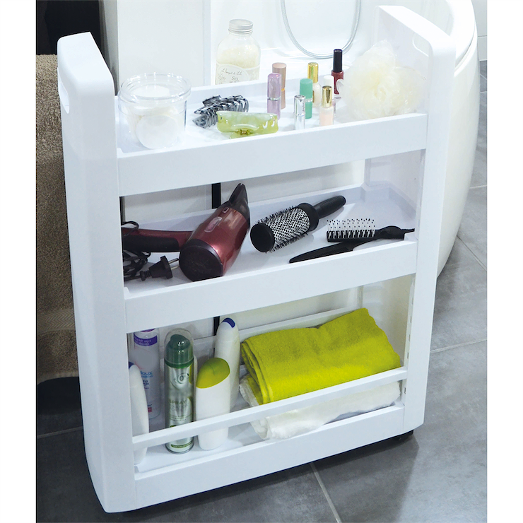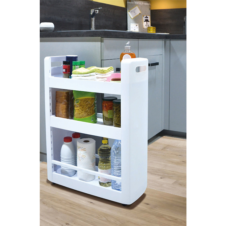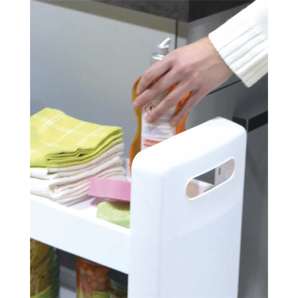 Uniwersalna i wielofunkcyjna szafka na kółkach, zmieści się nawet na bardzo małej przestrzeni, zapewniając dodatkowe miejsce do przechowywania. Pozwala na maksymalne zagospodarowanie małego pomieszczenia, jednocześnie umożliwia wygodny dostęp do przechowywanych przedmiotów. Można ją ustawić między meblami lub tam gdzie mamy mało miejsca. Idealnie nadaje się do małej łazienki, na półkach z łatwością można ułożyć wszelkie kosmetyki lub detergenty. Ułatwia zagospodarowanie niewykorzystanej lub nieustawnej przestrzeni w kuchni, można wstawić ją między szafki lub schować pod stołem, wówczas na półkach bez problemu zmieszczą się puszki, butelki, przybory do gotowania lub książki kucharskie. Szafka posiada 4 kółka, które ułatwiają przesuwanie. Biały kolor oraz prosty wzór sprawią, że pasuje do większości wnętrz, dzięki swojej prostocie zajmuje mało miejsca.