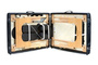 Łóżko, wraz z dodatkami, które mieszczą się wewnątrz, składa się do formy walizki zamykanej na klamry.