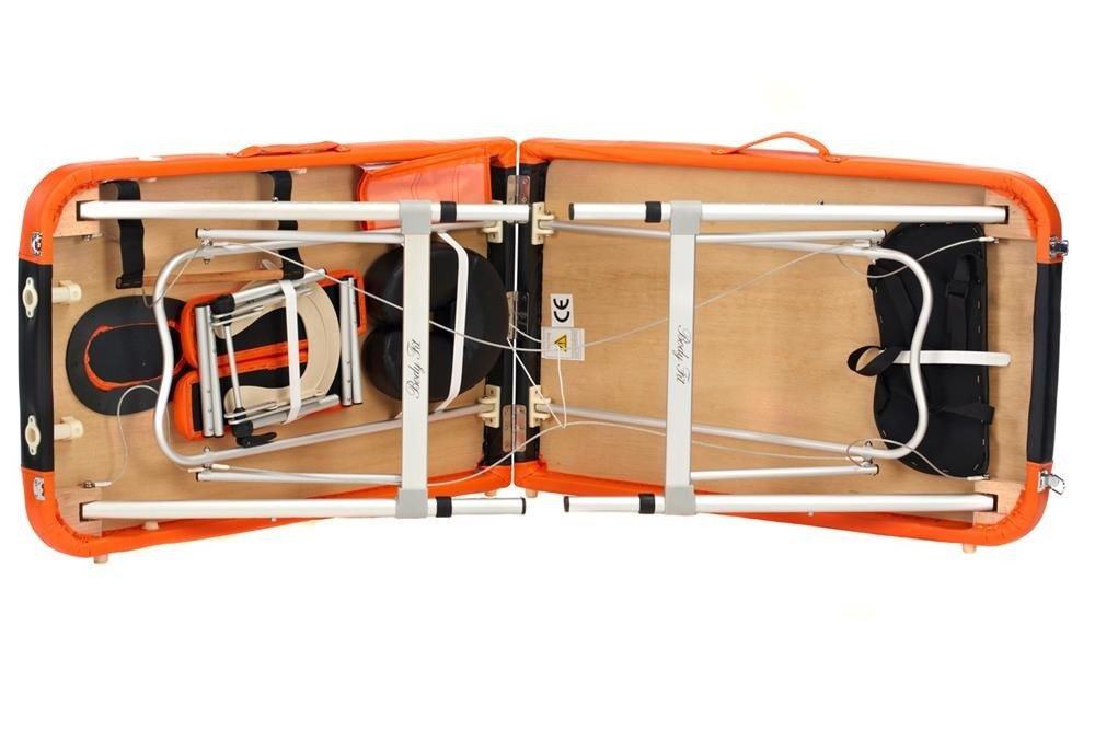 Łóżko, wraz z dodatkami, które mieszczą się wewnątrz, składa się do formy walizki zamykanej na klamry.