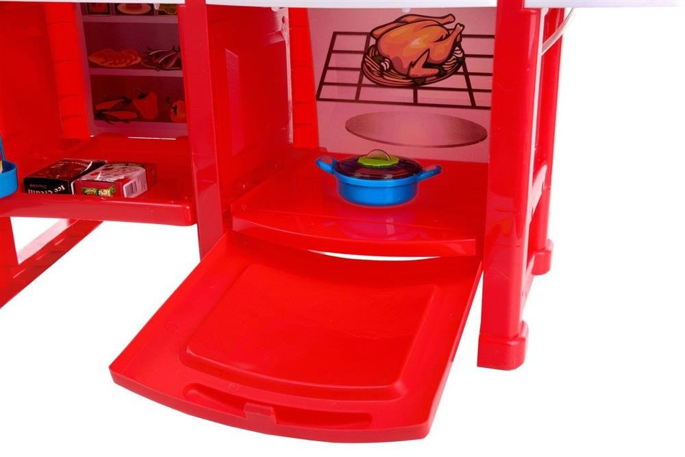 Dzieci znajdą tu płytę z dwoma polami grzejnymi, otwierany piekarnik, lodówkę, zlewozmywak, suszarkę do naczyń.