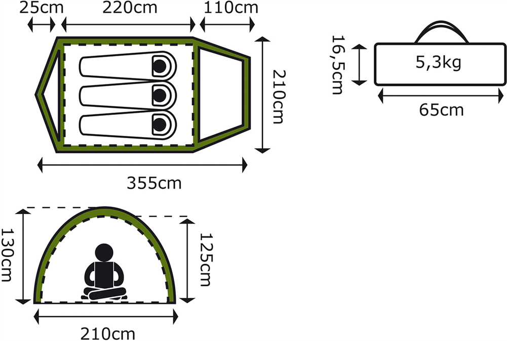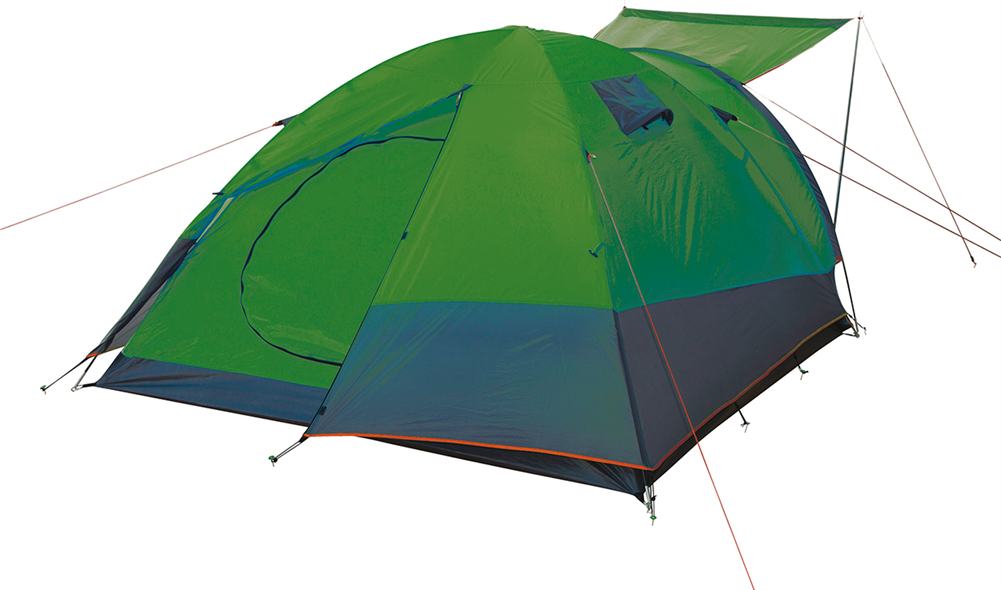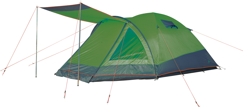 Praktyczny namiot trzyosobowy. Doskonale sprawdza się podczas wyjazdów i wypraw z plecakiem. Bardzo łatwy do rozłożenia. Zapewnia komfort odpoczynku dla trzech osób. Namiot wykonany jest z materiałów wodoodpornych, wszystkie szwy są podklejone. Specjalny wywietrznik z siatką zapewniając wysoki komfort użytkowania. Na szczycie kopuły zamocowany jest poręczy hak na którym można zwiesić lampę. Wewnątrz wszyte sześć poręczne kieszenie na drobiazgi.