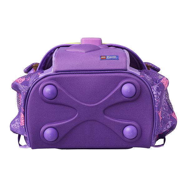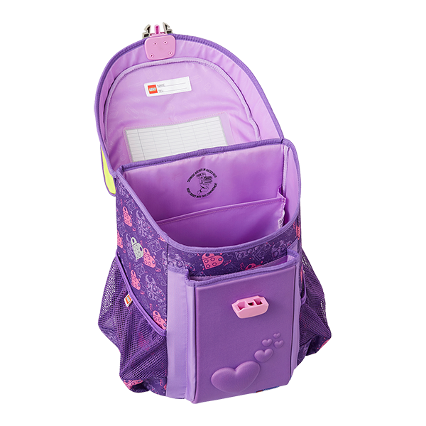 Ma dwie boczne kieszenie z siatki i małą kieszeń z przodu, która idealnie pasuje do naszego piórnika z klapką.