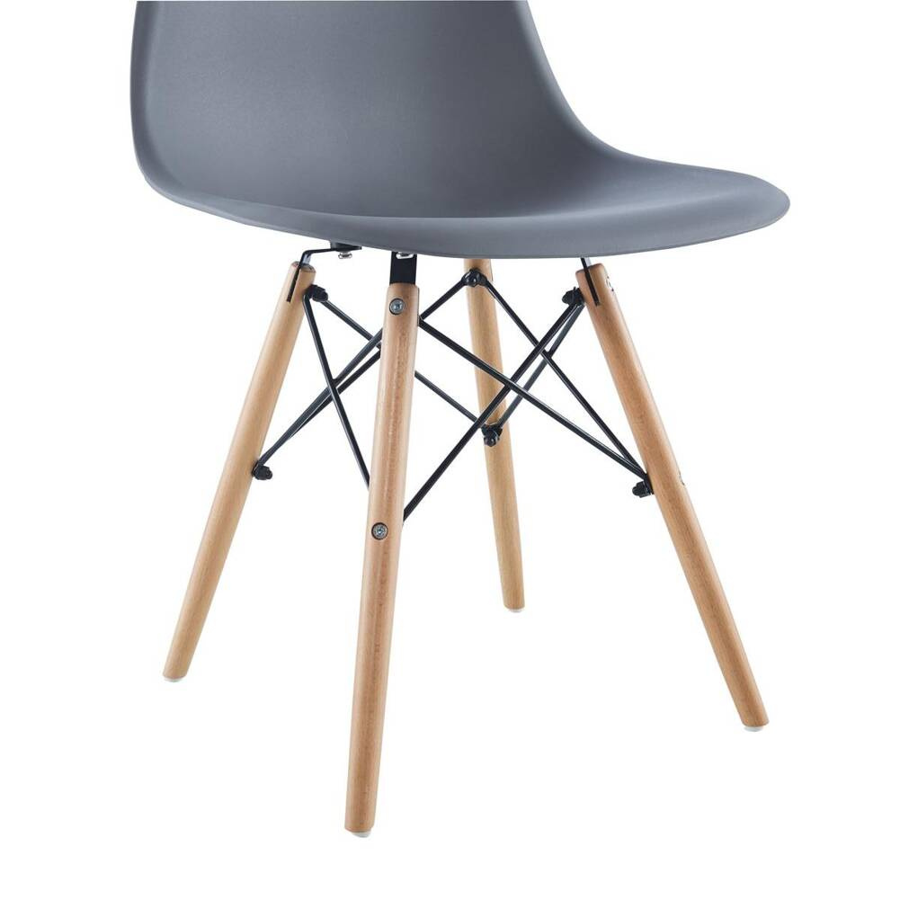 Opływowy kształt siedziska, nadaje mu delikatnego i miękkiego wyrazu. Wygodę siedzenia zapewnia odpowiednie wyprofilowanie. Tworzywo sztuczne o matowym wykończeniu gwarantuje odpowiednią wytrzymałość. 4 drewniane nogi, z rozpiętymi metalowymi prętami, nadają krzesłu lekko industrialny charakter.