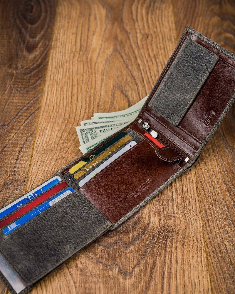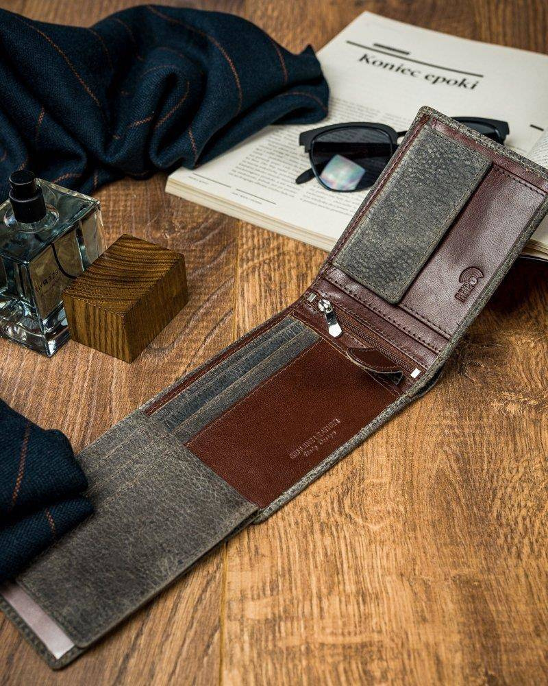Bardzo oryginalny portfel z rewelacyjną kolorystyką! Uszyty z jakościowej skóry naturalnej bawolej, która uzupełniona jest licową w większości wewnątrz portfela. Na froncie wszyto ładnie komponujące się kwadratowe logo marki.