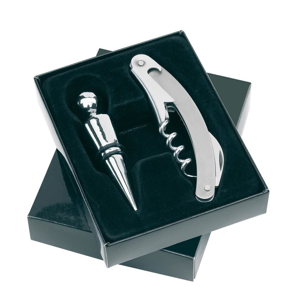 Zestaw do win Duet w czarnym pudełku z korkociągiem, otwieraczem do butelek, nożykiem i korkiem.