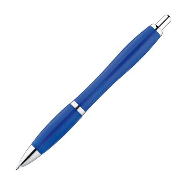 Plastikowy długopis z matowym uchwytem u dołu dla wygody w pisaniu.