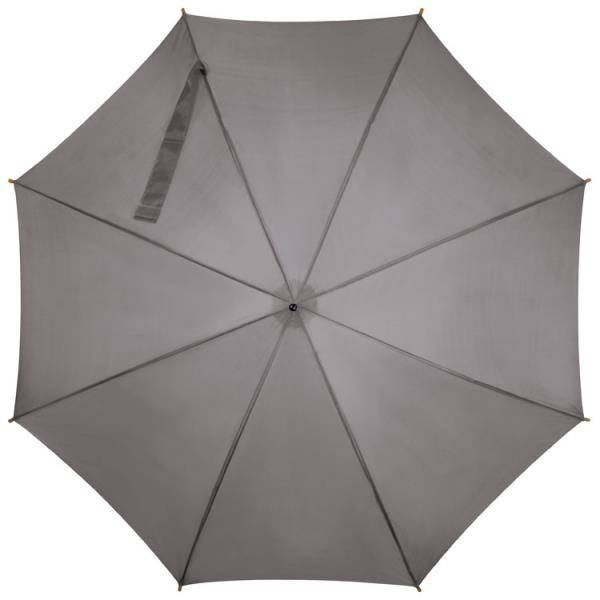 Ten prosty, stylowy parasol z drewnianą rączką i trzonem oraz wysokiej jakości metalowym stelażem.