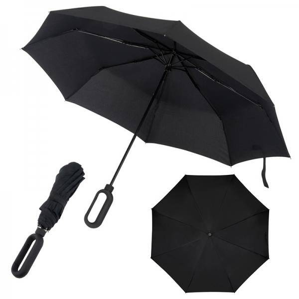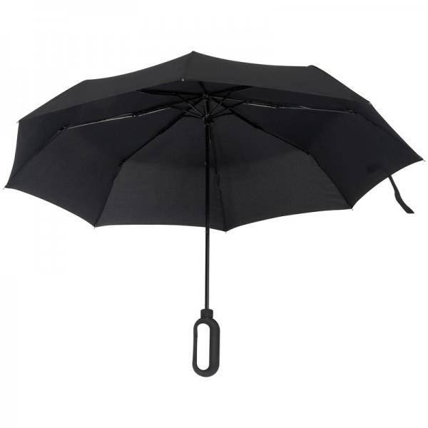 Niewielka parasolka z gumowaną rączką-karabińczykiem.