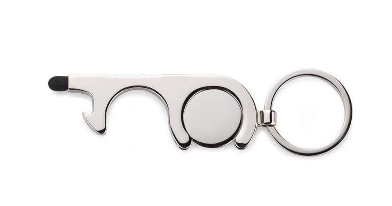 Brelok zawiera monetę do wózków sklepowych oraz pełni funkcję otwieracza do butelek.