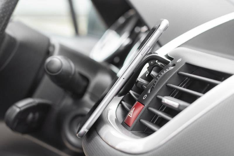 Uchwyt magnetyczny do telefonu do użycia w kratce wentylacyjnej samochodu. Wygodny klip do mocowania, w zestawie dwie srebrne blaszki.