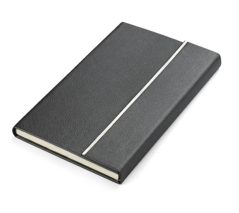 Wnętrze notesu wykonane z papieru o gramaturze 80 gram, 80 kremowych kartek w szare linie.