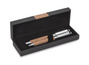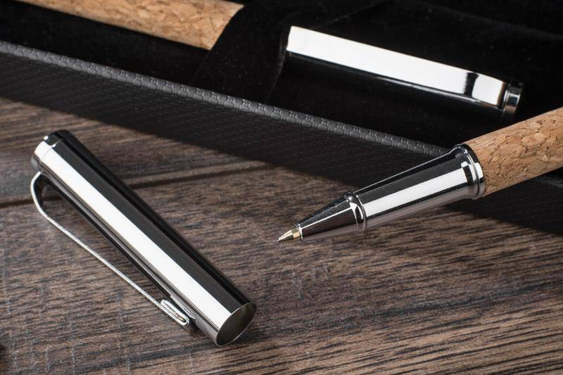 W zestawie znajduje się długopis oraz pióro kulkowe wykonane z metalu oraz korka.