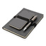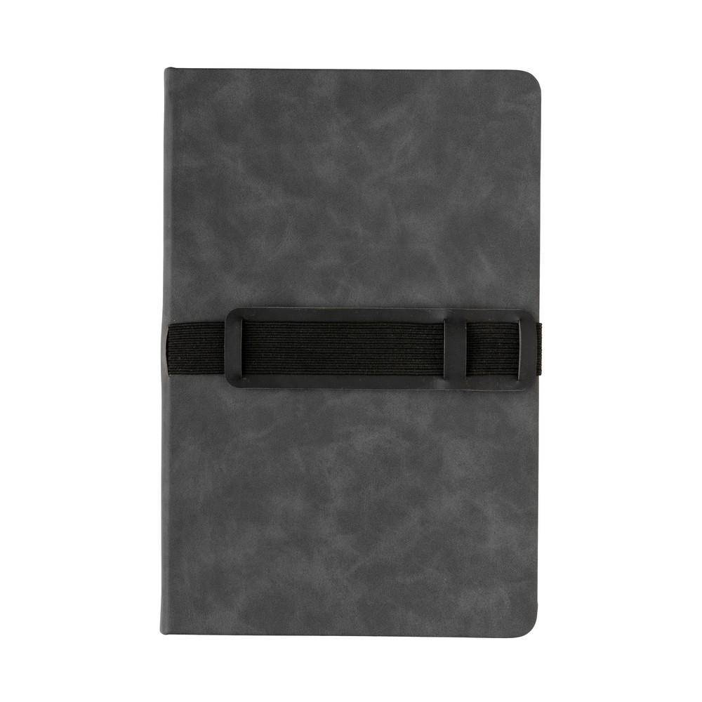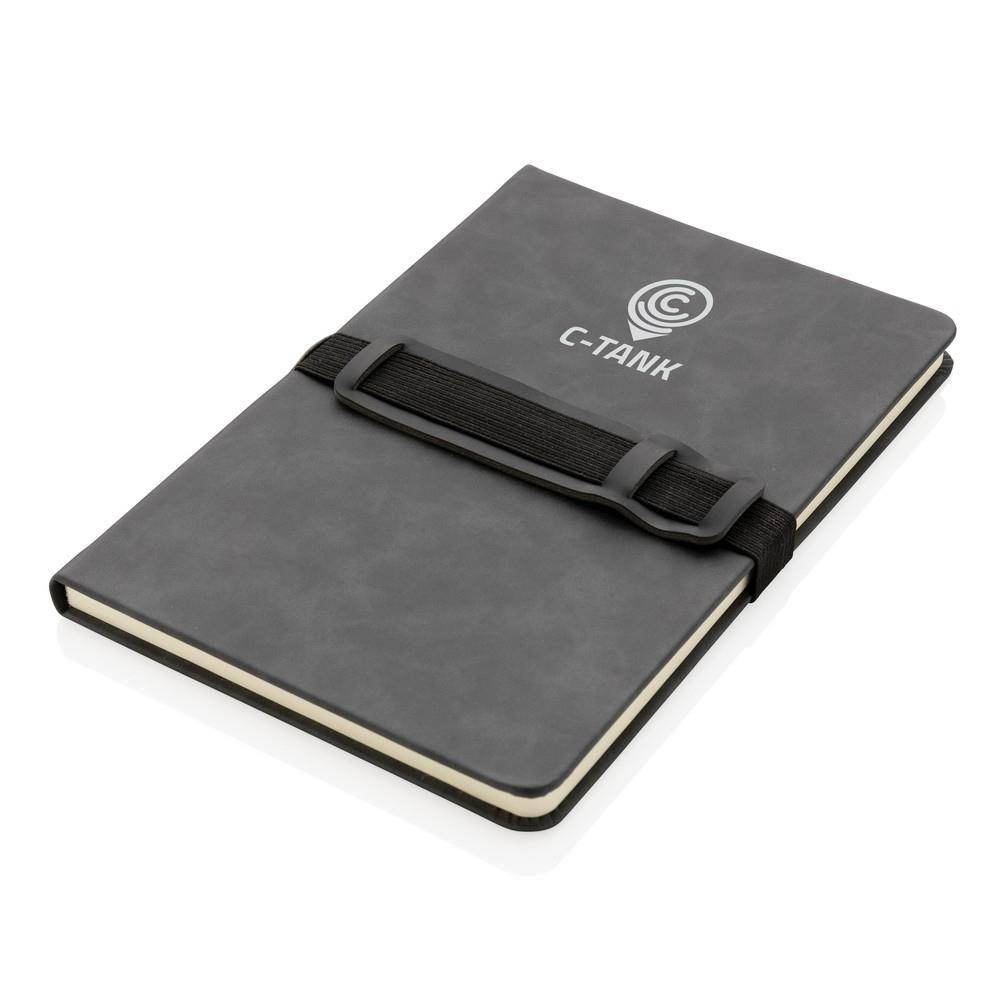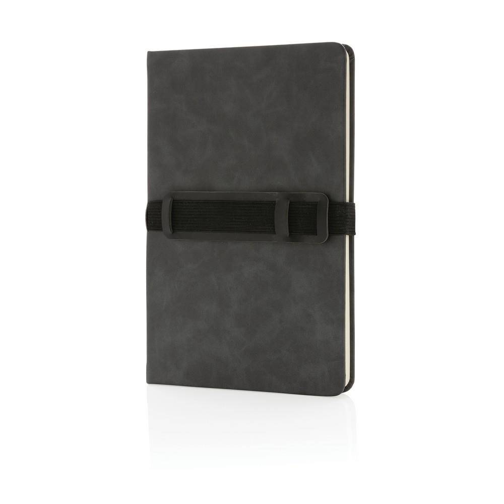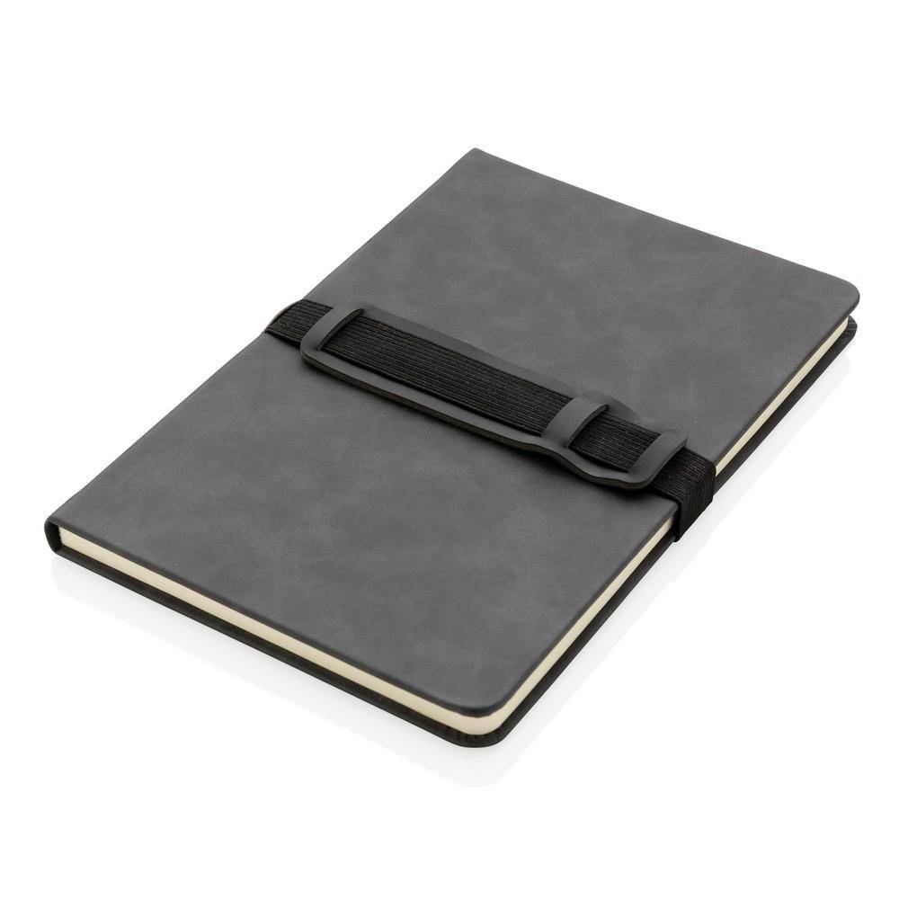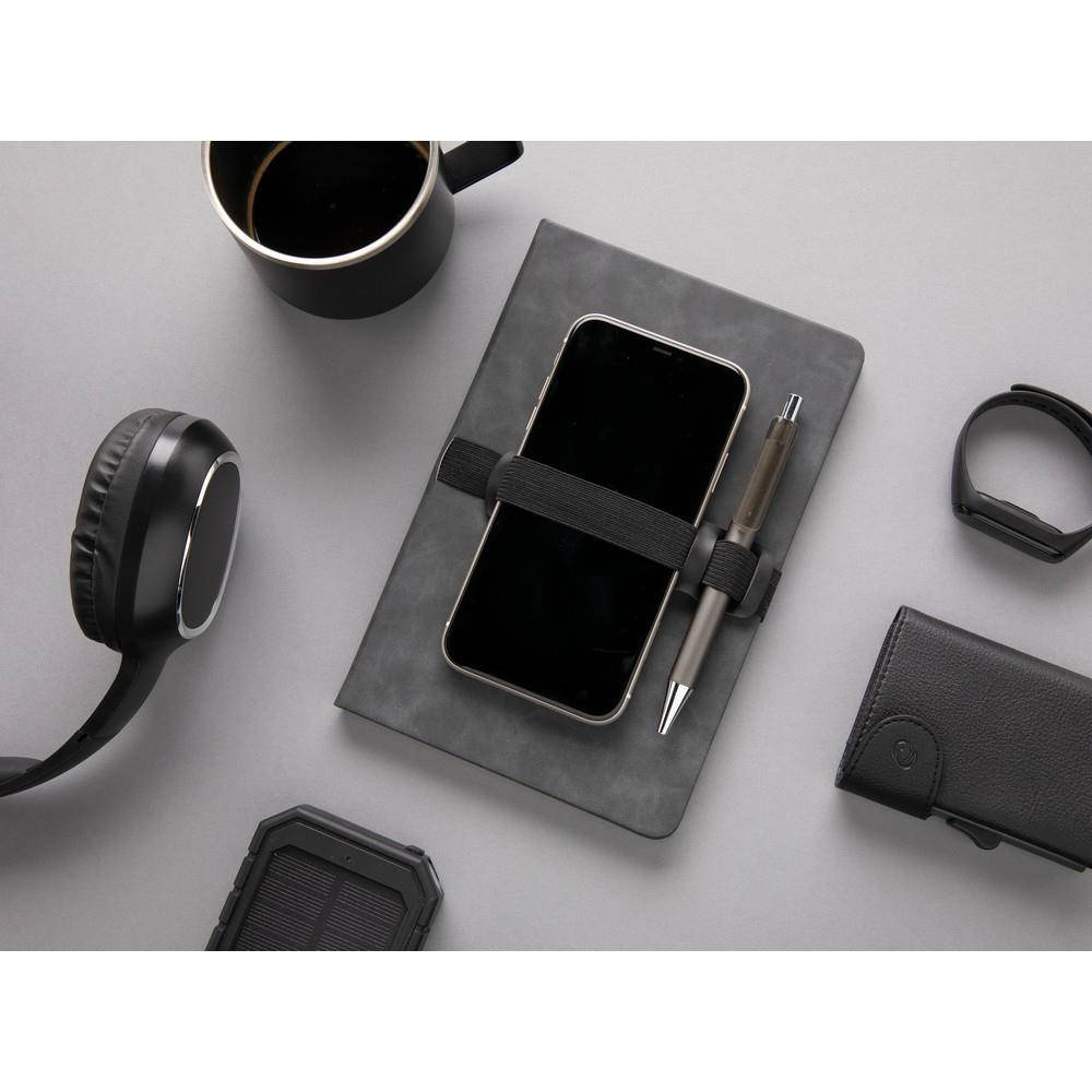 Notatnik A5 (80 kremowych kartek 70 g/m2 w linie), twarda okładka, na okładce specjalna opaska na telefon i długopis