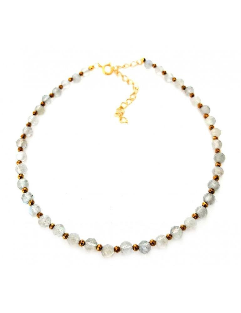 Bransoletka wykonana ze srebra próby 925,  pozłacanego 24 karatowym złotem Kamień: Labradoryt + Hematyt złoty(baza) Rozmiar kamienia: 2mm/4mm Długość :23 cm + przedłużka do 28 cm Możliwość modyfikacji kamienia WIĘCEJ INFORMACJI   Produkt wykonywany ręcznie.