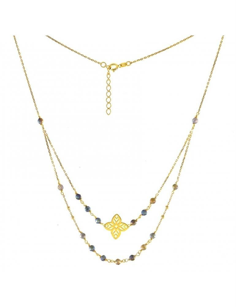 Naszyjnik wykonany ze srebra próby 925 , pozłacanego 24 karatowym, żółtym złotem Kamień: Labradoryt Rozmiar kamienia: 3 mm Długość :45 cm + przedłużka do 47