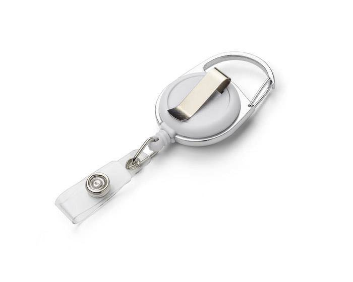 Wykonany z tworzywa skipass z metalowym zaczepem i karabińczykiem z wysuwaną linką, na której zawiesić można identyfikator lub inny dokument.