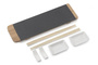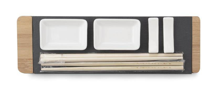 Zestaw zawiera bambusową podkładkę, na której umieszczona jest kamienna deska, bambusowe pałeczki z podstawkami oraz miseczki na sos.