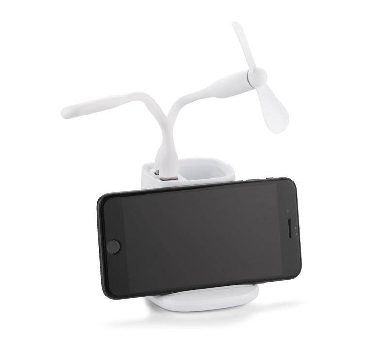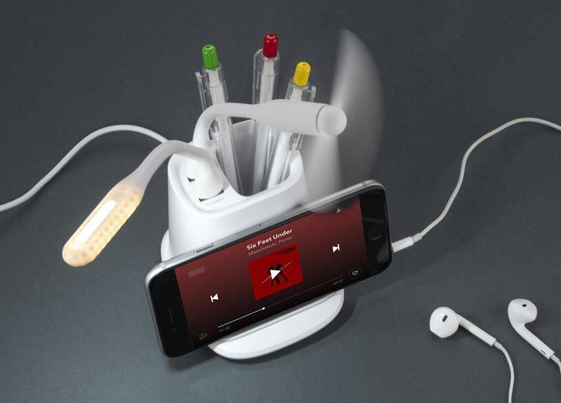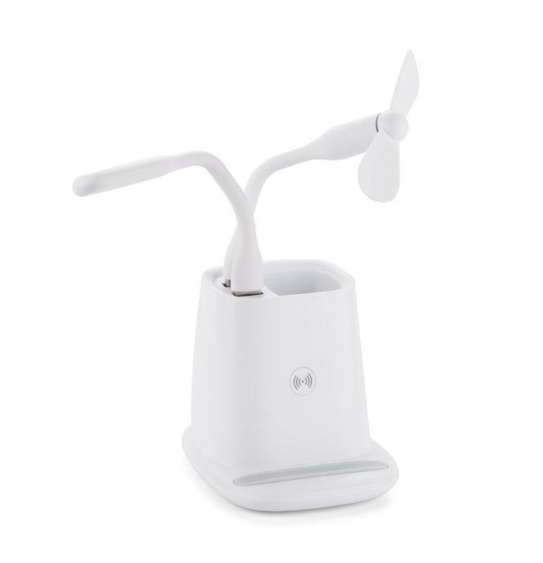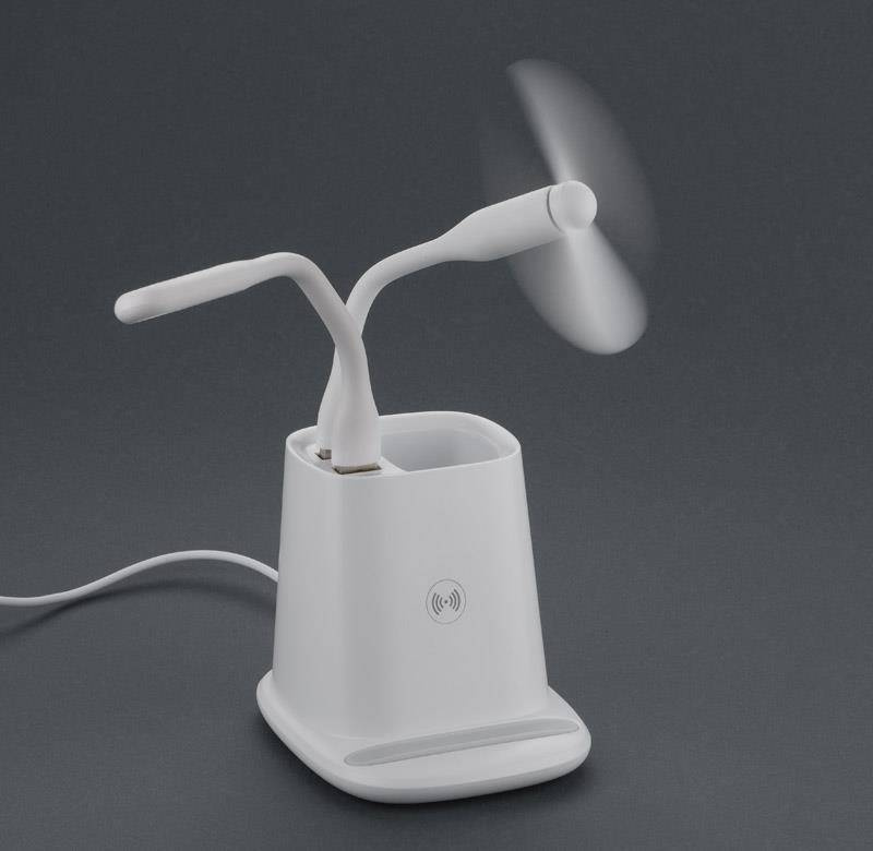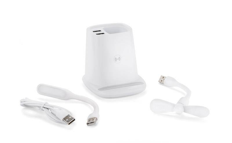 Przybornik na biurko BERGO to idealny gadżet do pracy przy biurku. Posiada on wbudowaną ładowarkę bezprzewodową, która służy również jako stojak do telefonu i dwa porty USB, które zasilą dołączone do produktu akcesoria: wiatraczek i lampkę. W przypadku niekorzystania z akcesoriów porty USB mogą funkcjonować jako hub. Dane techniczne: wejście micro USB: 5V/2A, wyjście ładowarki bezprzewodowej: 5W, 2 wyjścia USB: 5 V/2A (maks.)