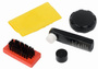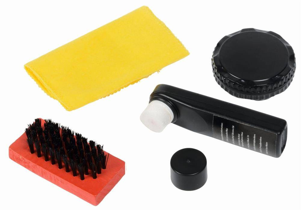 Zestaw do czyszczenia obuwia SMALL SHINE składający się z drewnianej szczotki, ściereczki do polerowania (ok. 23 x 10 cm), bezbarwnego oleju z gąbką do aplikowania, gąbki z bezbarwnym olejem silikonowym, wewnątrz przezroczystego opakowania z zamkiem.