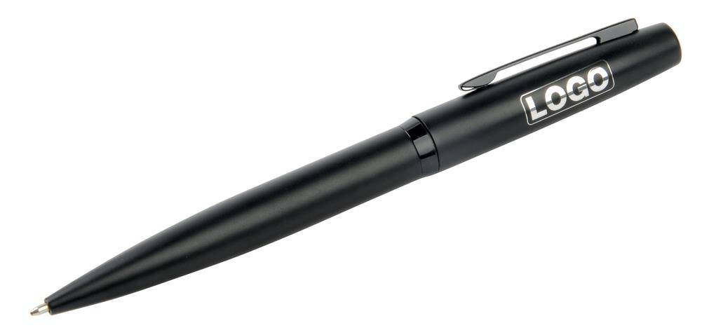 Metalowy długopis SIGNATURE z mechanizmem obrotowym, z matowego metalu, błyszczącym klipsem i centralnym pierścieniem, z chromowaną podstawą do grawerowania, niebieskim tuszem, pakowany w pudełko.