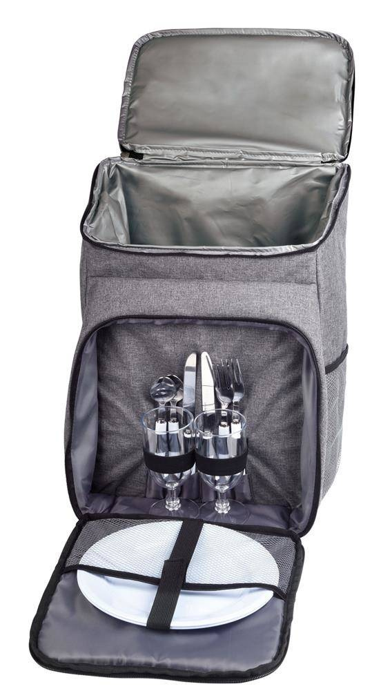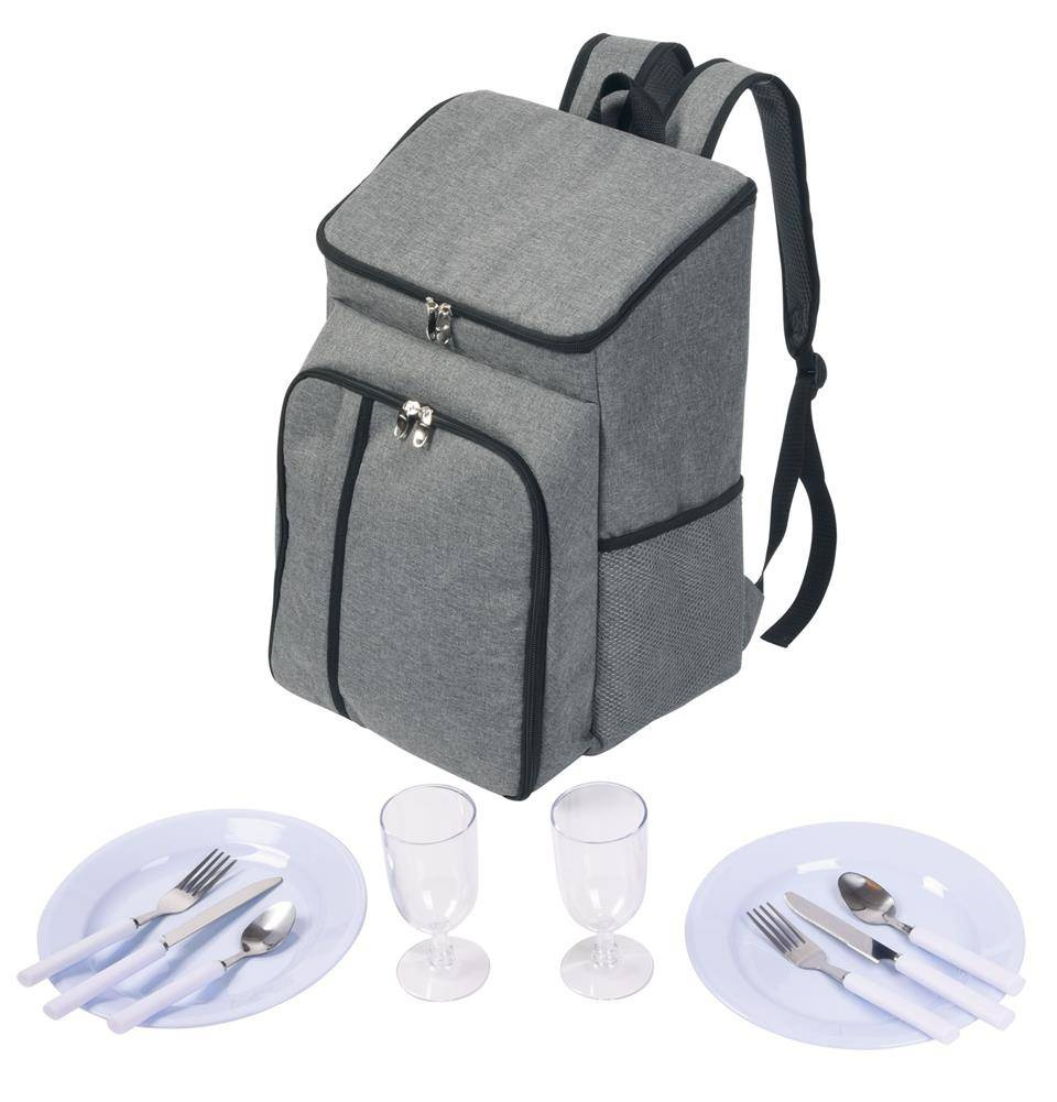 Plecak piknikowy LEISURE DAY dla 2 osób. Z izolowaną kieszenią główną. Przednia kieszeń zamykana na zamek błyskawiczny zawiera sztućce, plastikowe naczynia i plastikowe kieliszki do wina. Dwie boczne kieszenie z siatki, uchwyt do przenoszenia i wyściełane szelki.