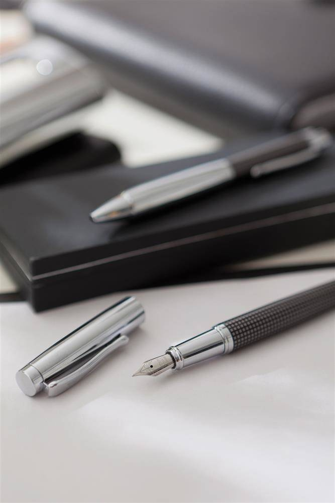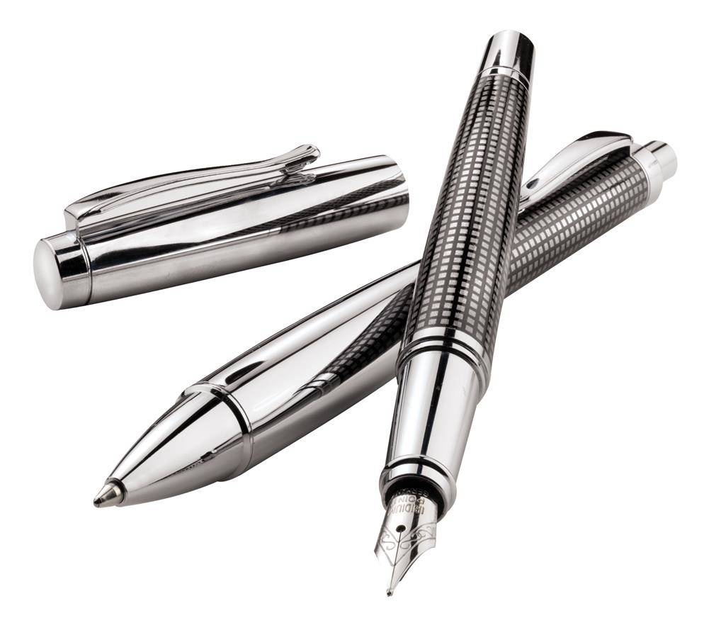 - metalowe pióro wieczne i długopis z mechanizmem przyciskowym (niebieski tusz),