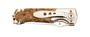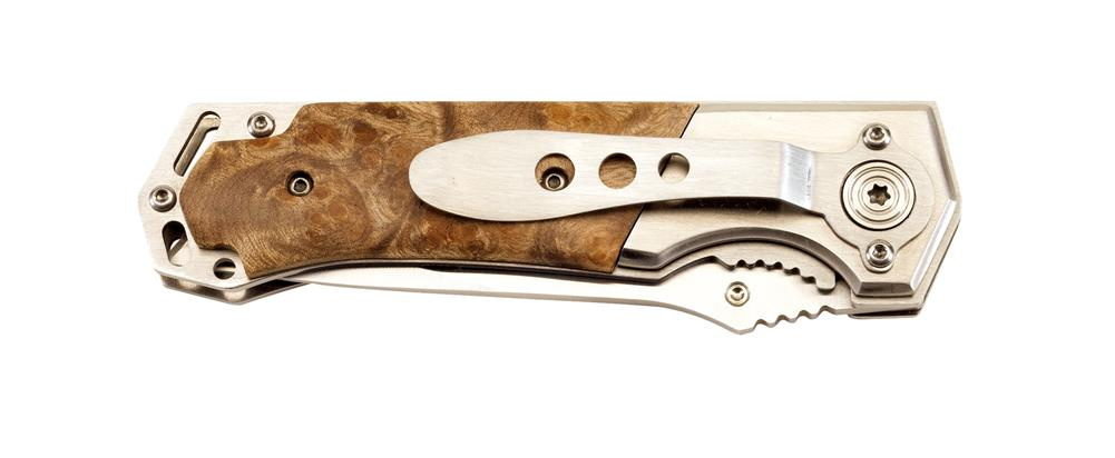 Nóż składany HUNTER z dużym ostrzem, drewnianym wzorem na uchwycie i klipsem na pasek, pakowany w drewniane pudełko.