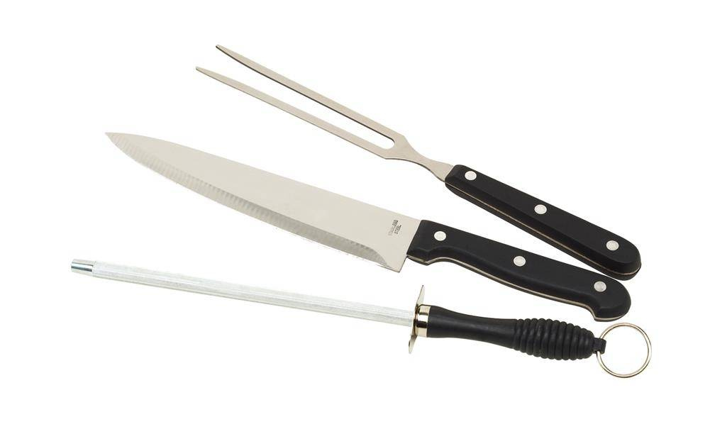 3-częściowy zestaw ze stali nierdzewnej CARVE składa się z ostrzałki z metalowym oczkiem do zawieszania, noża i widelca do mięsa, zapakowany w proste pudełko.