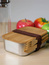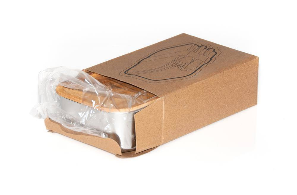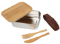 Pudełko śniadaniowe ECO TASTE ze stali nierdzewnej, z bambusowym wieczkiem. Widelec i nóż z bambusa umieszczone w dopasowanej opasce przytrzymującej pokrywkę pojemnika. Pojemność ok. 600 ml.