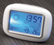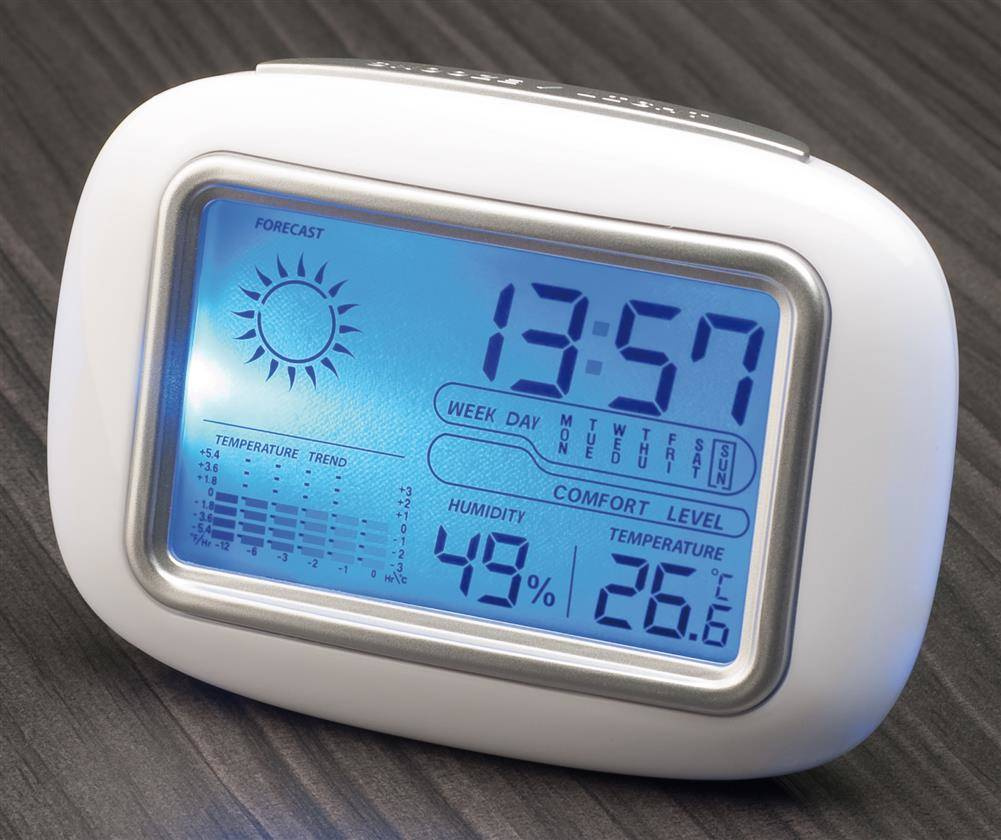 Stacja pogodowa CALOR z termometrem, higrometrem, wyświetla godzinę i wilgotność powietrza, niebieskie podświetlenie LED, wykonana z białego plastiku ABS.