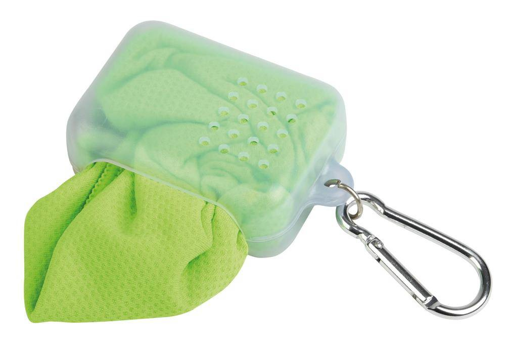 Ręcznik chłodzący z mikrofibry COOL DOWN. Z pętelką, w przezroczystej puszce z karabińczykiem. Aby uzyskać efekt chłodzenia zanurz ręcznik w wodzie, wykręć go i strzepnij. Idealny do fitnessu i aktywności sportowych.