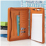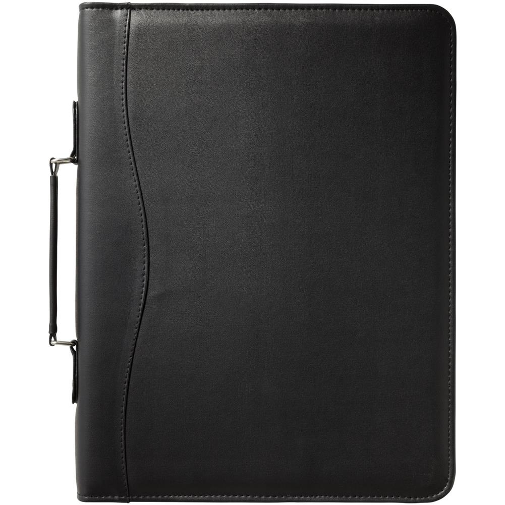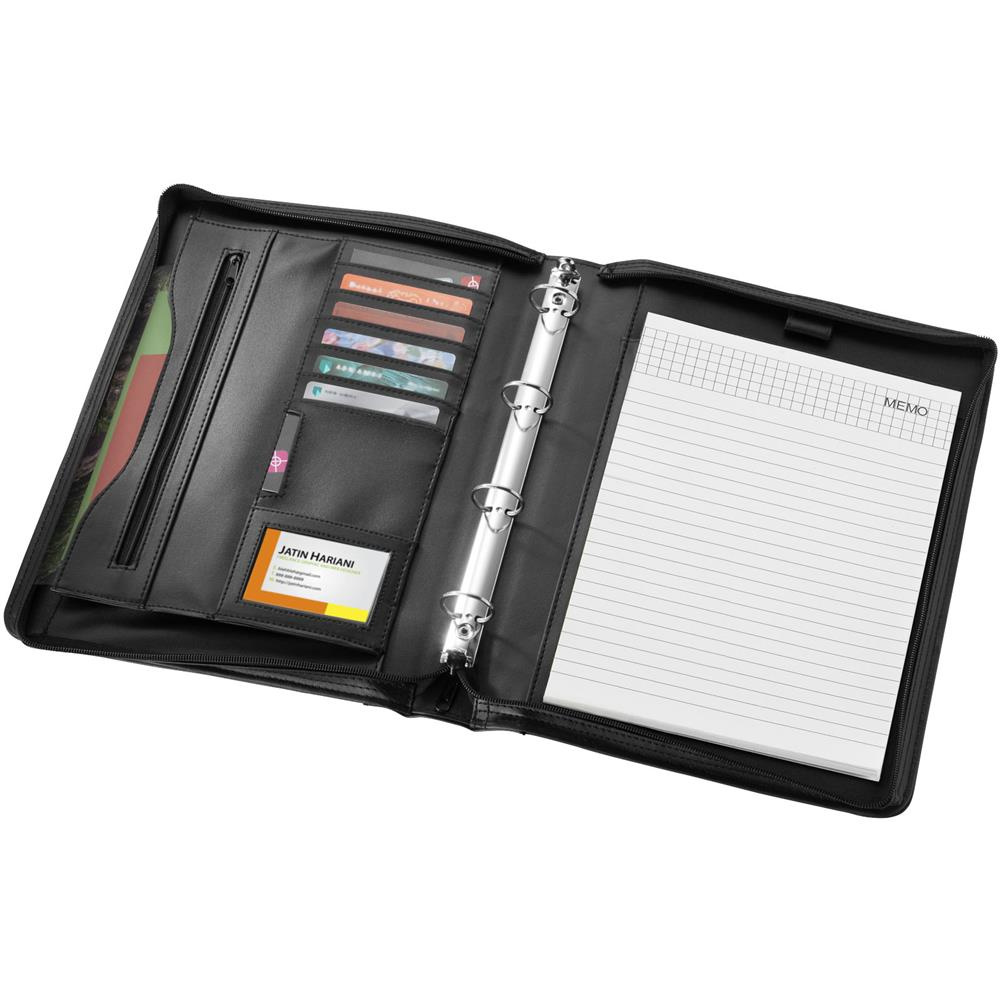 Portfolio zapinane na zamek z uchwytem, kółkami segregatora, zapinaną na zamek kieszonką i kieszeniami na dokumenty.