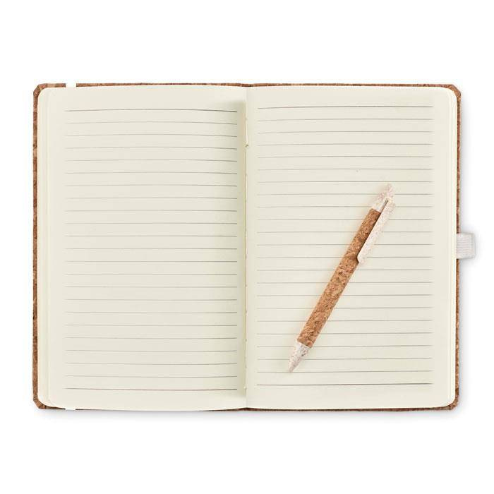 Notatnik A5 w linie w oprawie z korka oraz długopis z korkową obudową.