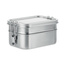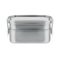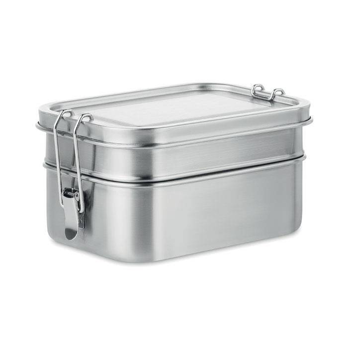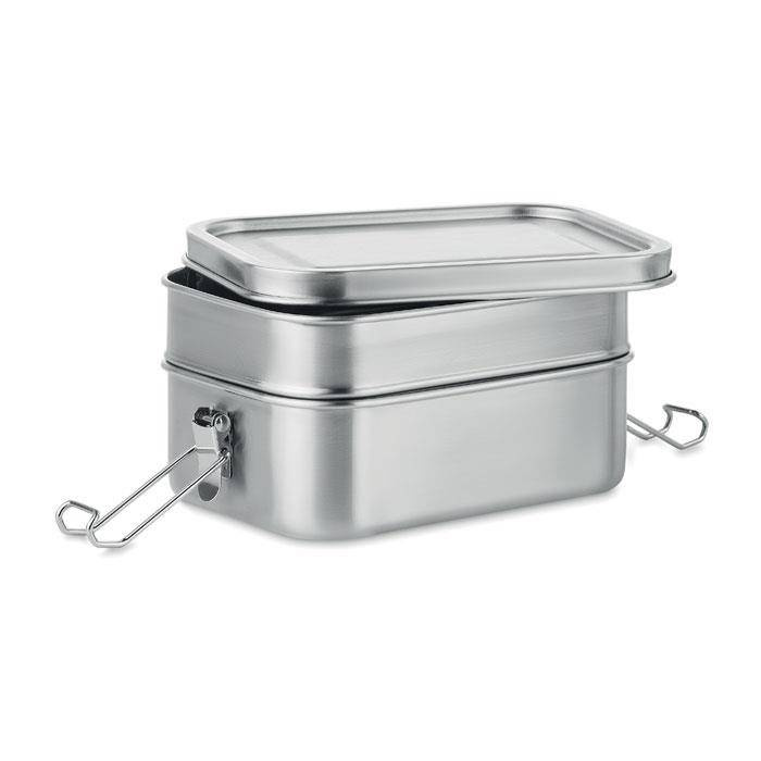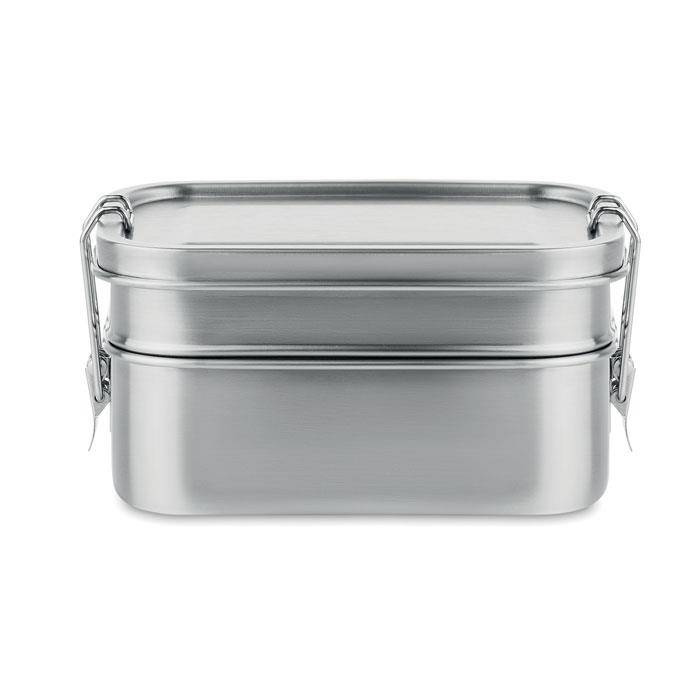 Pojemnik na drugie śniadanie ze stali nierdzewnej, 2 komory z mocnymi i bezpiecznymi klamrami bocznymi.