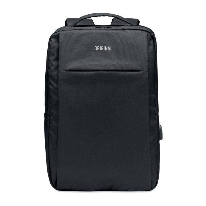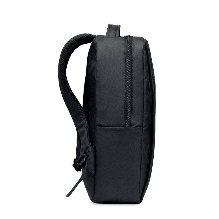 Plecak na komputer z poliestru 300D RPET z wyściełanym paskiem na ramię, zawiera jedną główną komorę wewnętrzną na laptopa 13 cali i kabel USB do ładowania.