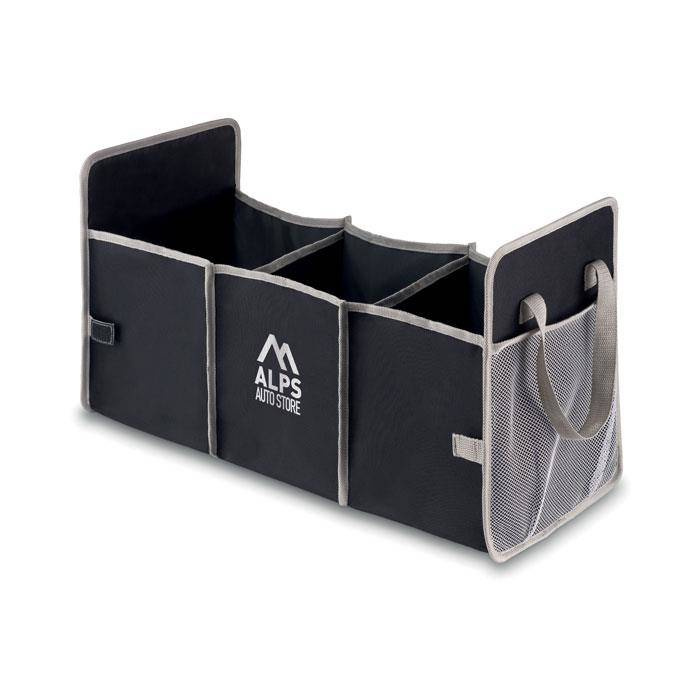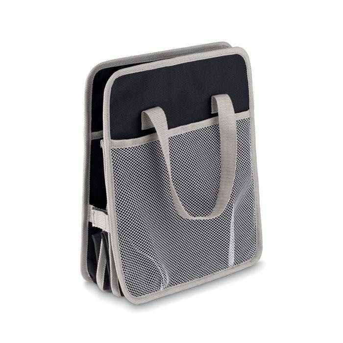 Składany organizer samochodowy z poliestru 600D, wyposażony w boczną kieszeń z siatki.