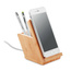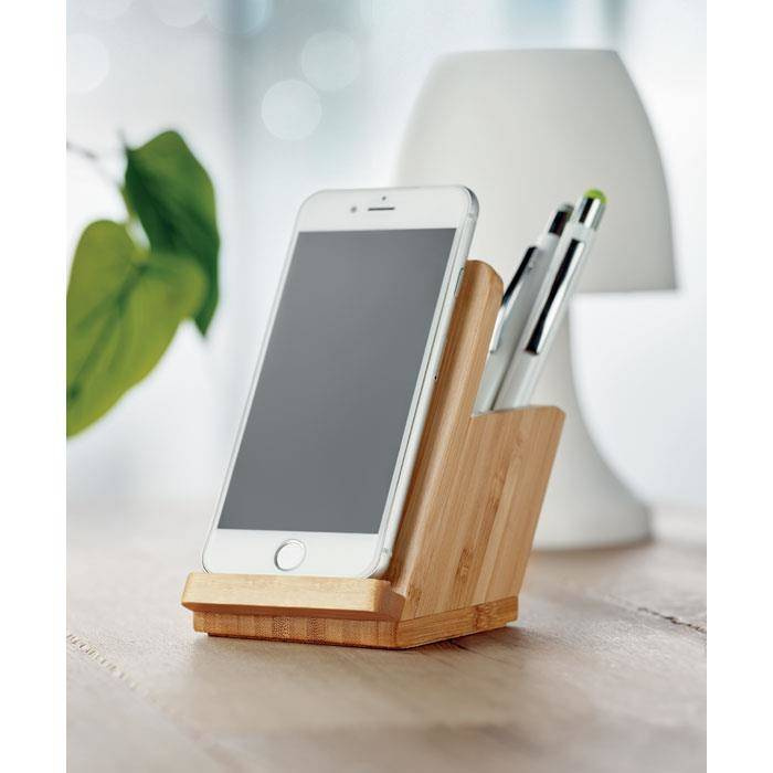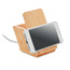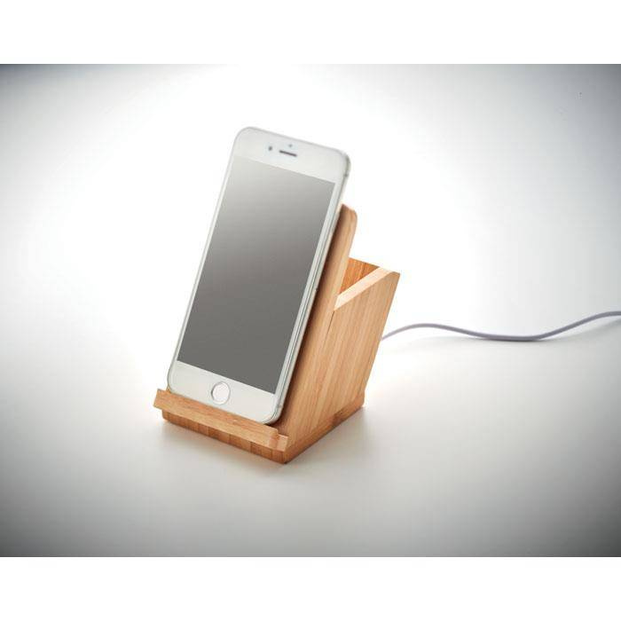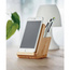 Bezprzewodowa ładowarka w bambusowej obudowie z funkcją pojemnika na długopisy.