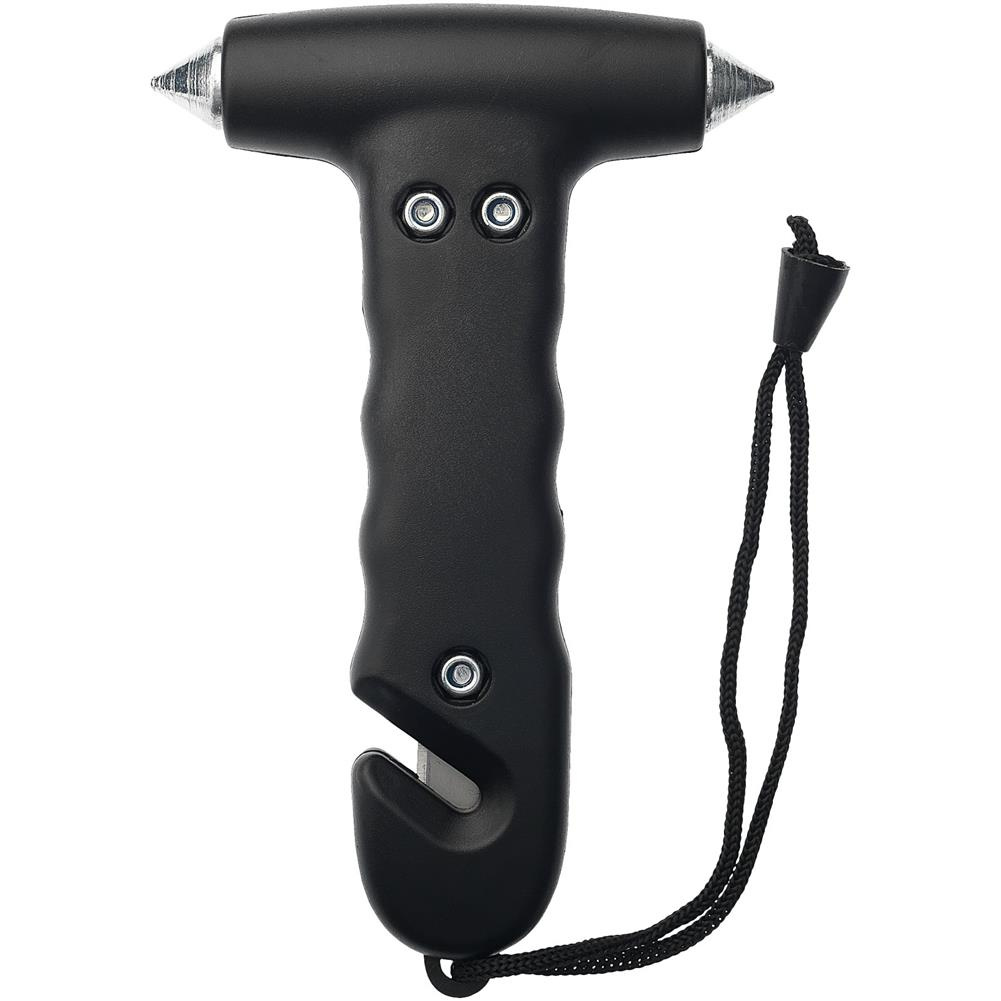 Młotek ratunkowy z paskiem na nadgarstek i wbudowanym przecinakiem do pasów w rękojeści. W sytuacji alarmowej można zastosować dwa ostre wybijaki do okien ze stali hartowanej i przecinak do pasów.